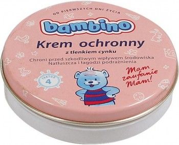 BAMBINO 75ml Krem ochronny z tlenkiem cynku Krem ochronny do twarzy, ciała i pupy. Jest szczególnie delikatnym produktem do codziennej ochrony wrażliwej skóry niemowląt i dzieci. Dzięki zawartości tlenku cynku, talku i olejów mineralnych zapobiega powstawaniu stanów zapalnych oraz skutecznie łagodzi podrażnienia skóry. Tlenek cynku dodatkowo sprawia, że krem chroni przed szkodliwym działaniem czynników zewnętrznych: wiatru, zimnego i suchego powietrza oraz promieni słonecznych (faktor 4). Nie zawiera konserwantów ani barwników. Może być stosowany już od pierwszych dni życia dziecka, na całe ciało dziecka w celu nawilżenia i właściwej pielęgnacji skóry.