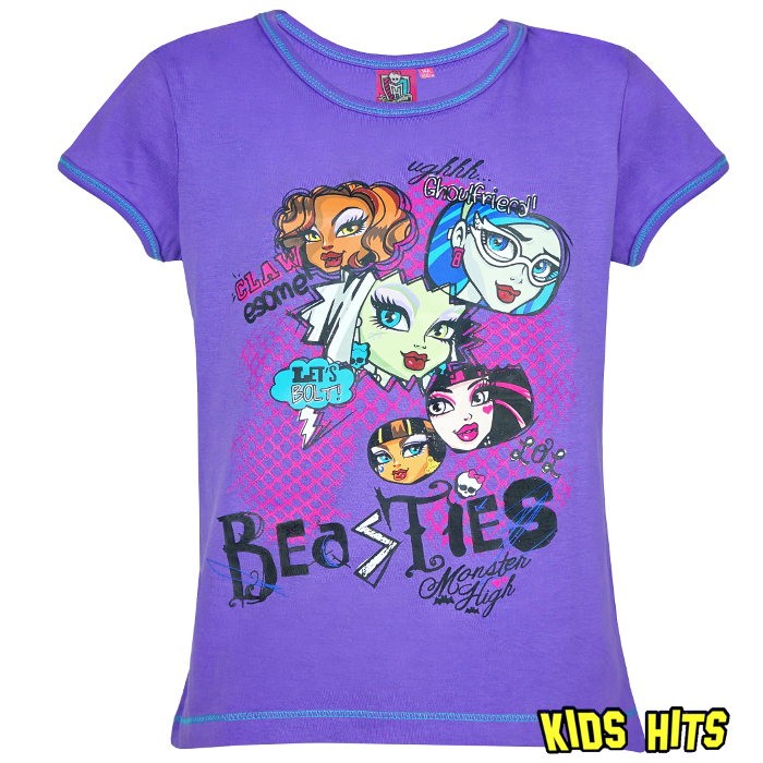 Dziecięca koszulka Monster High "Beasties" Dziewczęca koszulka z dużym motywem z bajki Monster High. Wykonana z bardzo dobrej gatunkowo, przyjaznej dla skóry bawełny. Świetny jakościowo nadruk - praktycznie niewyczuwalny i niezwykle trwały. Oryginalna koszulka Monster High Skład: 100% bawełna wysokiej jakości Rozmiar: 10 lat (140 cm) Kids Hits - w 100% oryginalna odzież dla dzieci i dorosłych